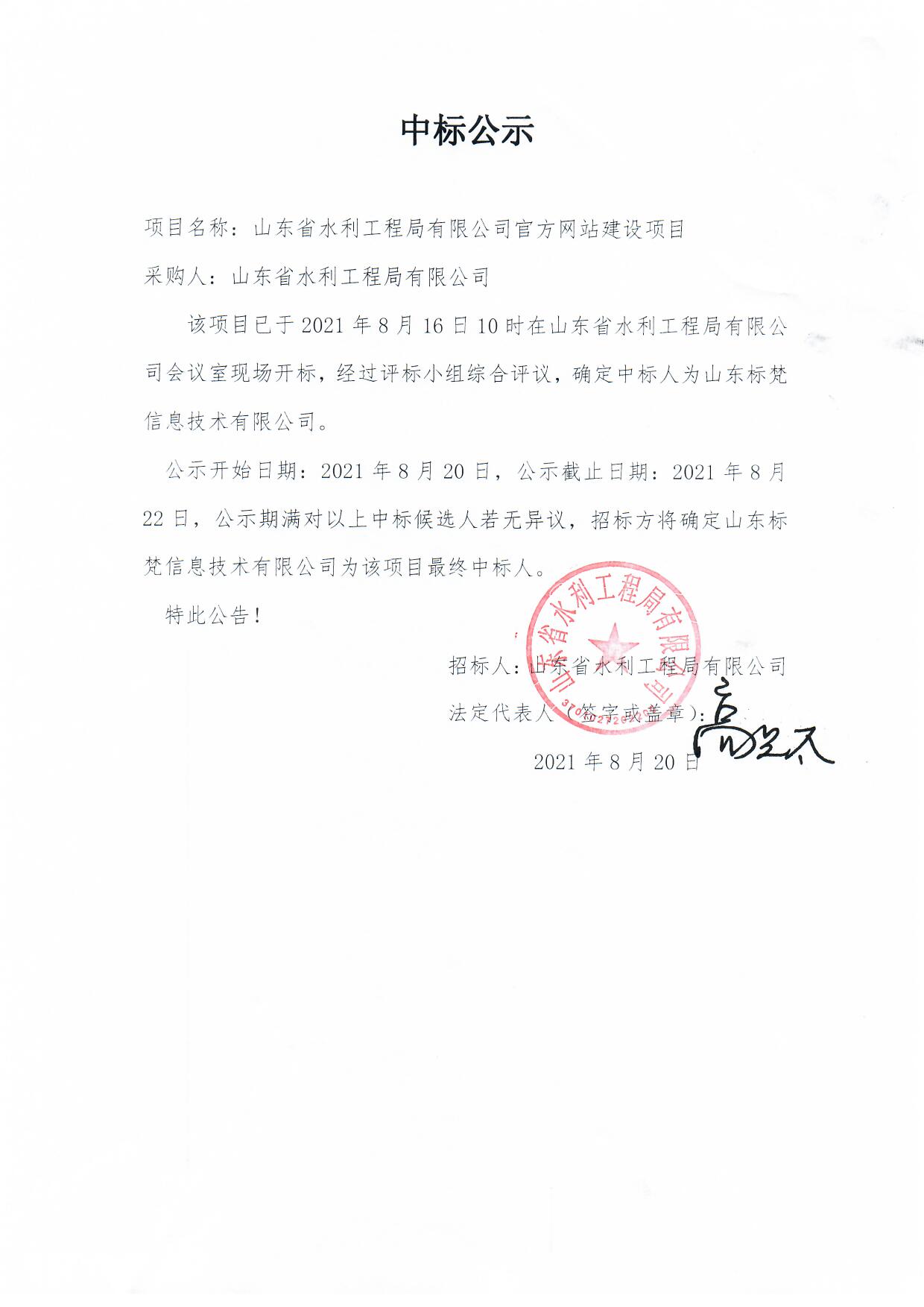 山東省水利工程局有限公司官方網(wǎng)站建設(shè)項(xiàng)目中標(biāo)公示