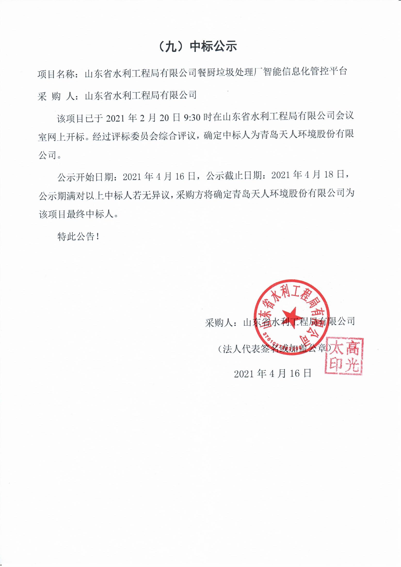 山東省水利工程局有限公司餐廚垃圾處理廠智能信息化管控平臺中標公示