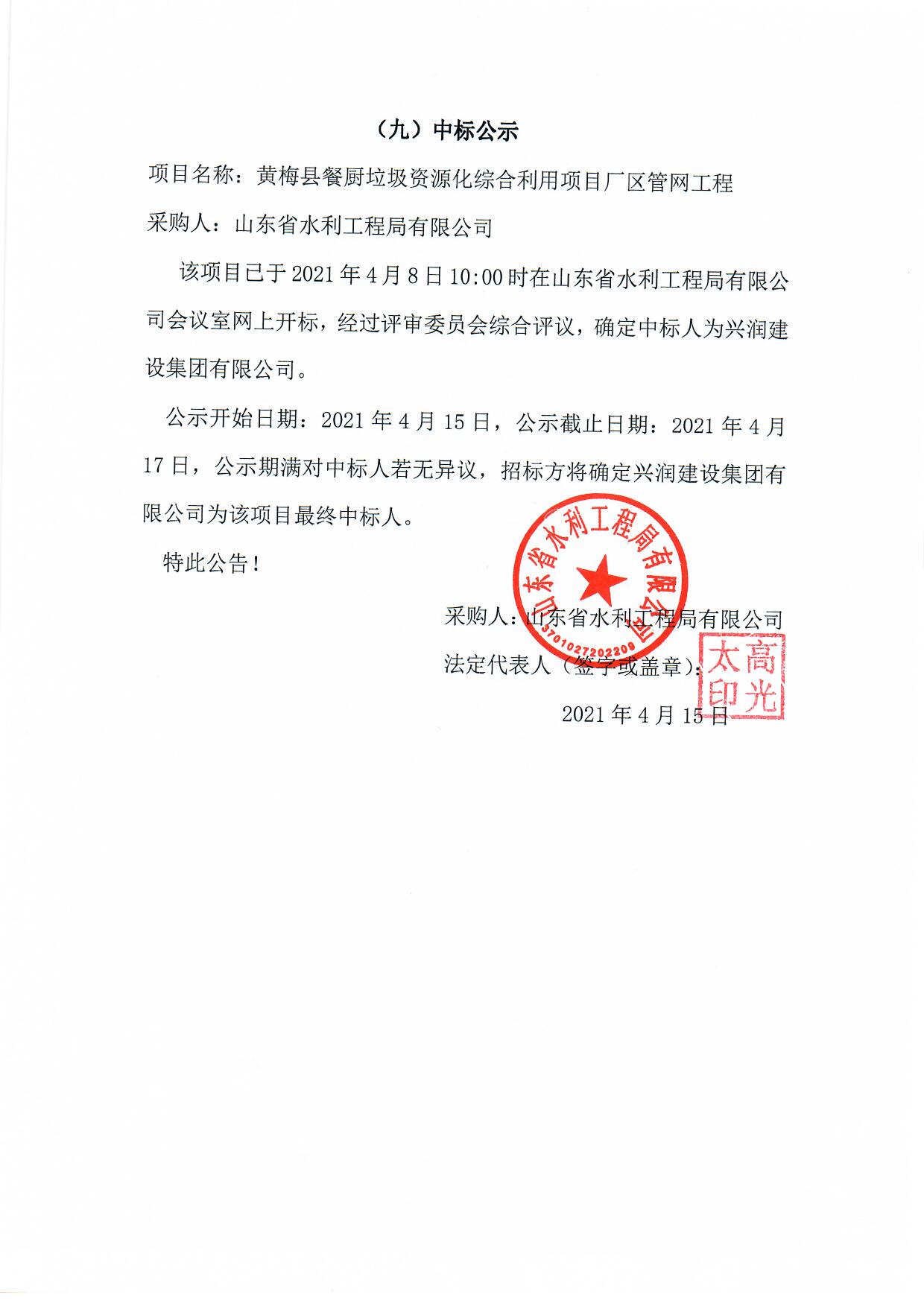 山東省水利工程局有限公司餐廚垃圾處理廠智能信息化管控平臺中標(biāo)公示