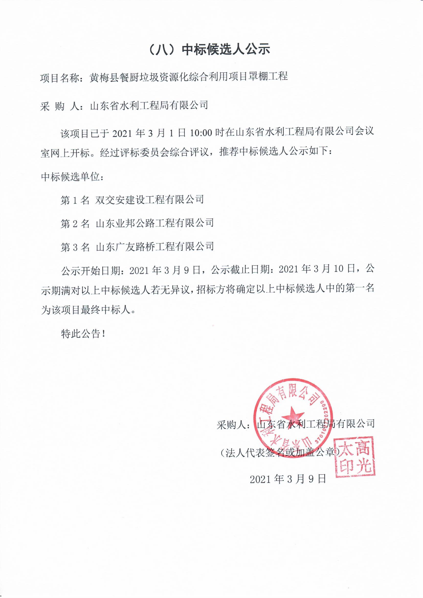 黃梅縣餐廚垃圾資源化綜合利用項目罩棚工程中標候選人公示