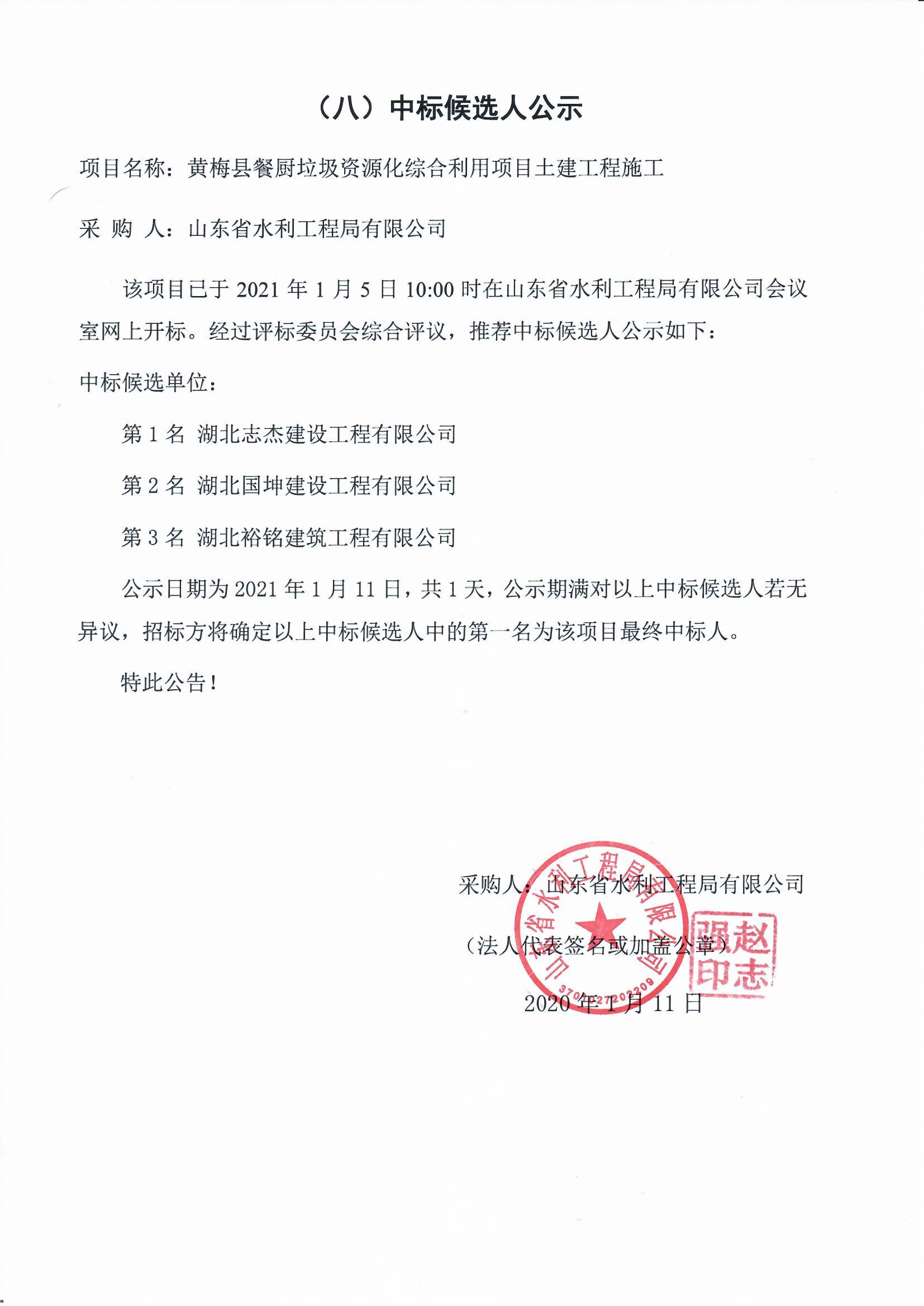 黃梅縣餐廚垃圾資源化綜合利用項目土建工程施工中標(biāo)候選人公示