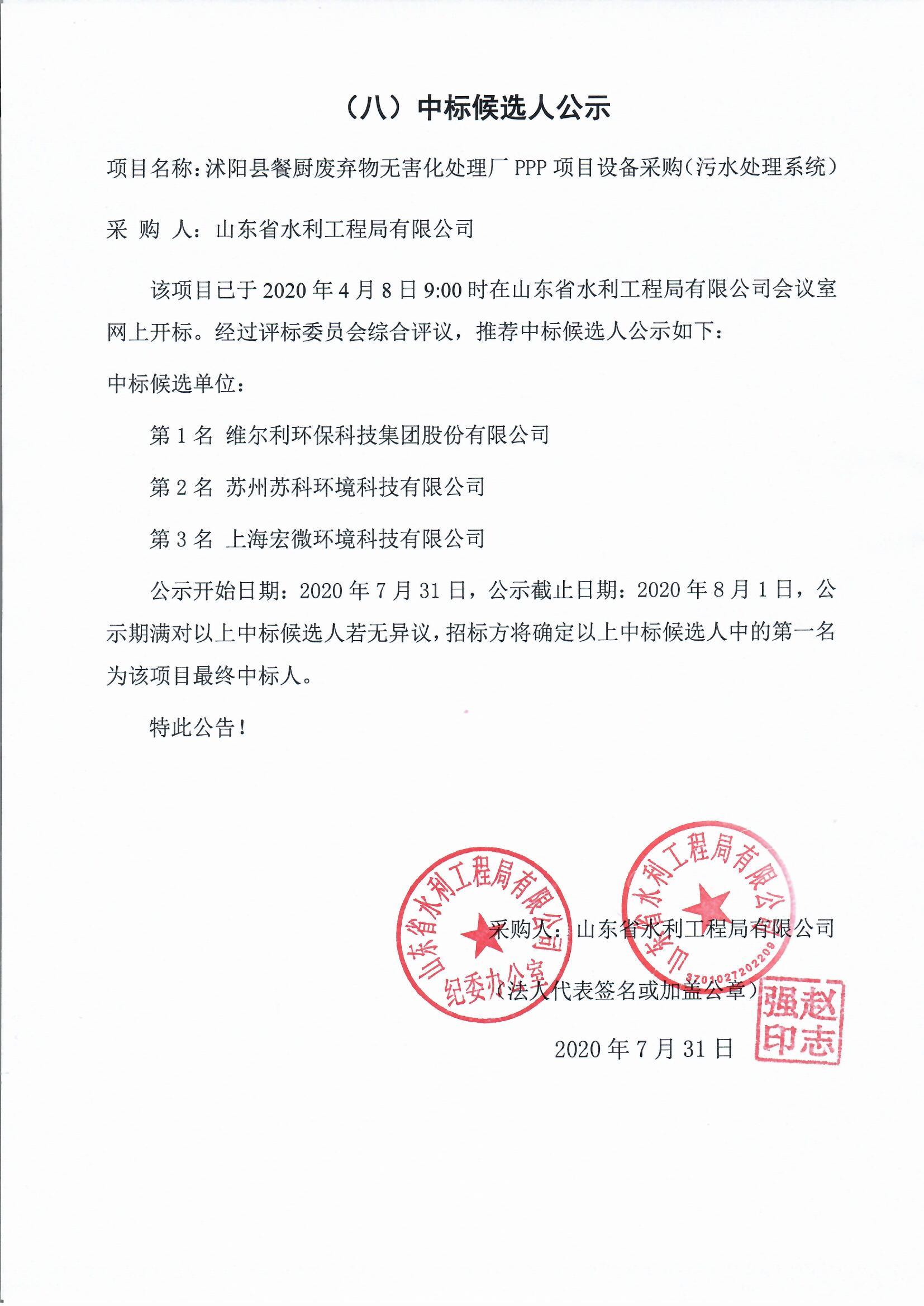 沭陽(yáng)縣餐廚廢棄物無(wú)害化處理廠PPP項(xiàng)目設(shè)備采購(gòu)(污水處理系統(tǒng))中標(biāo)候選人公示