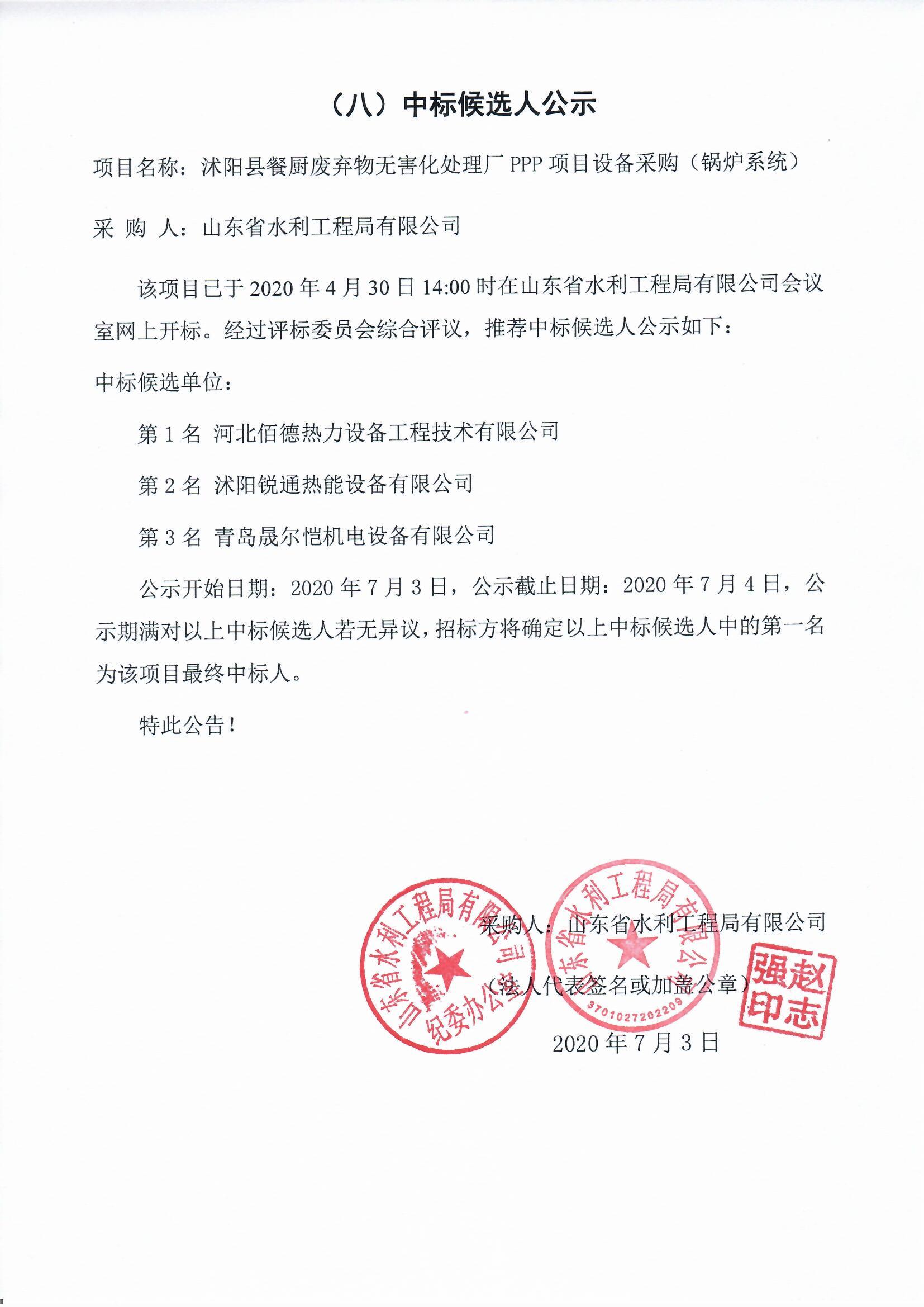 沭陽縣餐廚廢棄物無害化處理廠PPP項目設備采購(鍋爐系統(tǒng))中標候選人公示