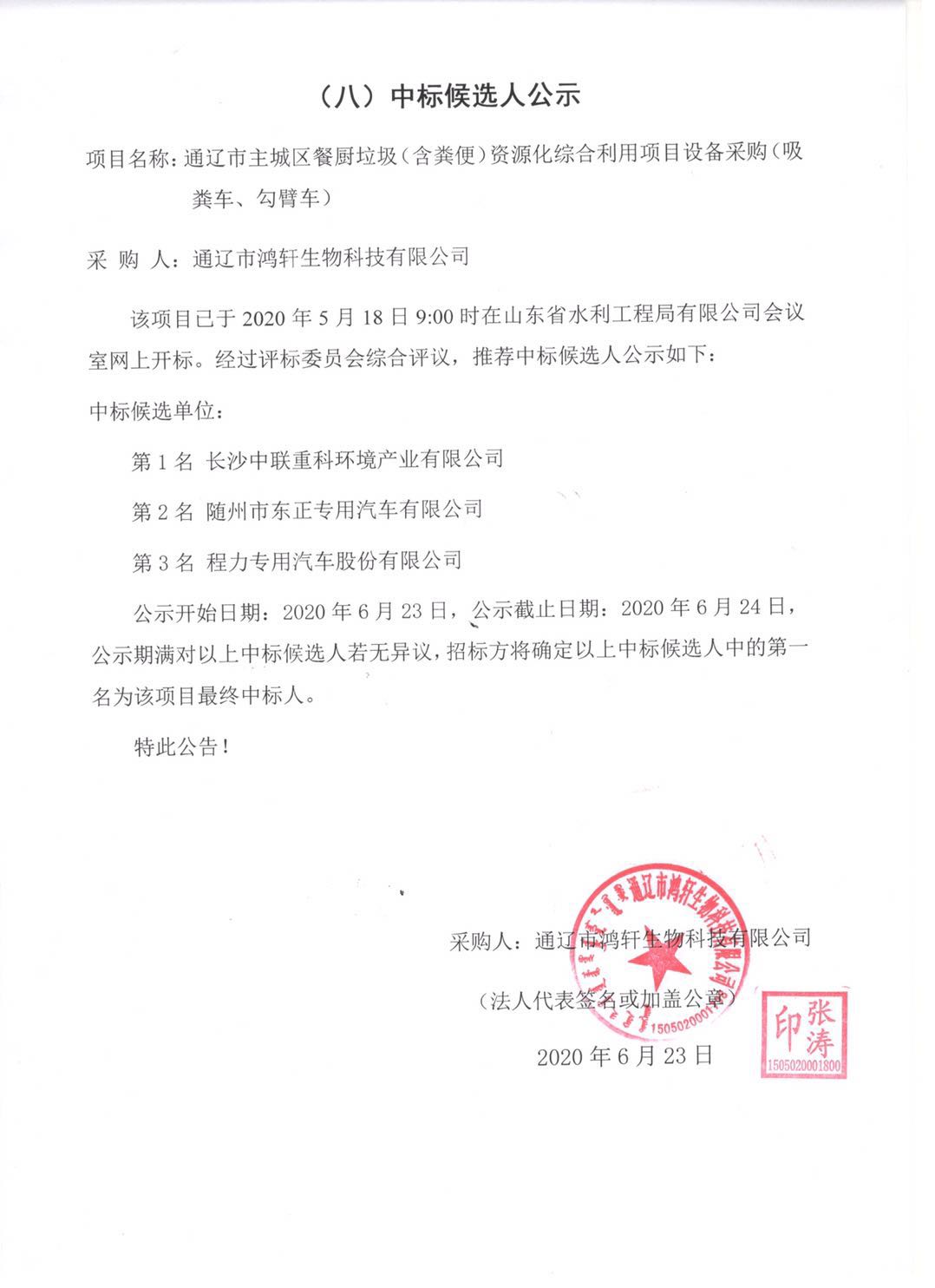 通遼主城區(qū)餐廚垃圾(含糞便)資源化綜合利用項(xiàng)目設(shè)備采購(gòu)中標(biāo)候選人公示