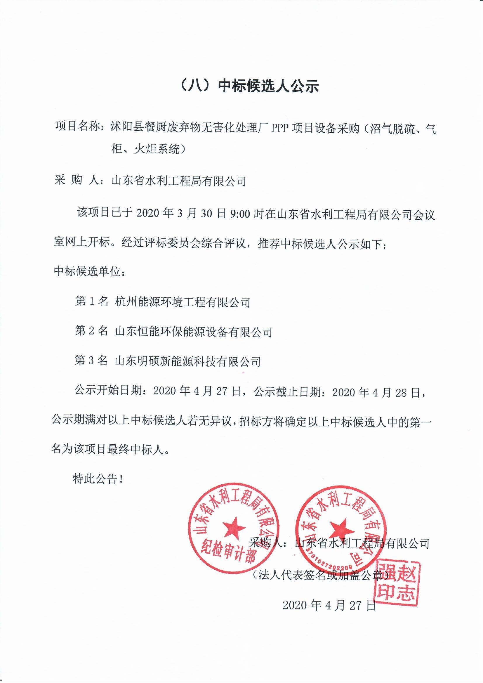 沭陽縣餐廚廢棄物無害化處理廠PPP項目設(shè)備采購中標候選人公示