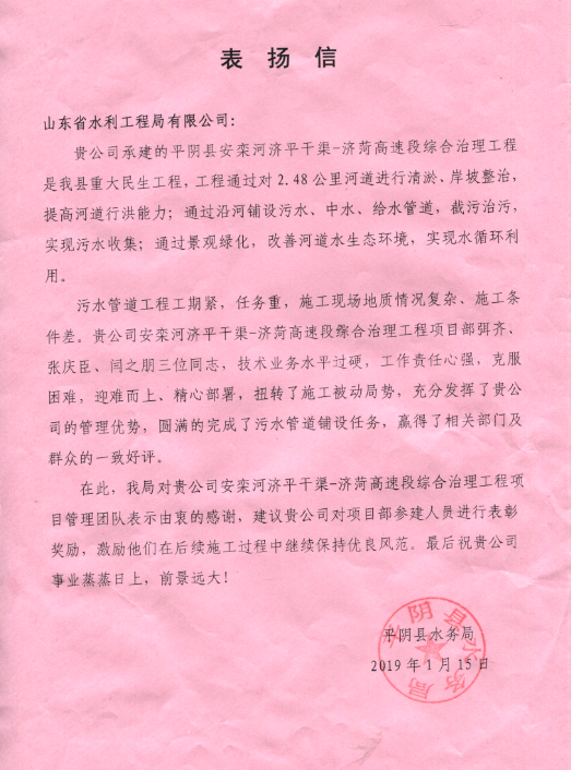 2019近日,平陰縣安欒河濟平干渠至濟菏高速段綜合治理工程三標段項目經(jīng)理部收到來自平陰縣水務(wù)局的表揚信,對項目部2018年在安全管控、施工管理、工程進度等方面的工作給予充分肯定,對弭齊、張慶臣、閆之朋等三位同 ...